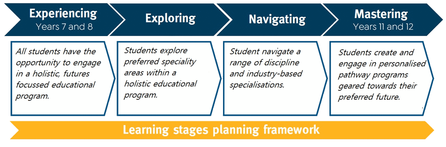Progression from Year 7 to Year 12 at Palmview is based on an understanding that student learning progresses through key developmental stages of experiencing, exploring, navigating, and mastering the curriculum. Shaping curriculum through these learning stages enables a responsiveness to the diversity of rates of student progression to individual personal best. Units within each course at Palmview will be written to align with these learning stages.